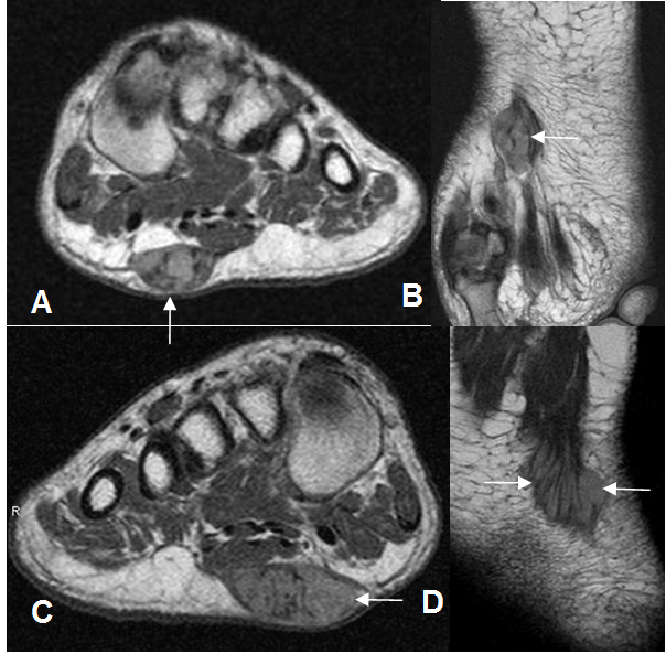 C: RM coronal y D: RM axial con contraste. Igual paciente anterior con lesión en el otro pie, que compromete los ramos faciales del 1º, 2º y 3º dedo, por fibromatosis.
