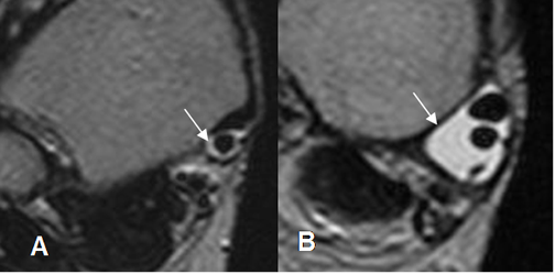 A: RM axial en T2. Escaso líquido rodeando el tendón, como hallazgo normal.