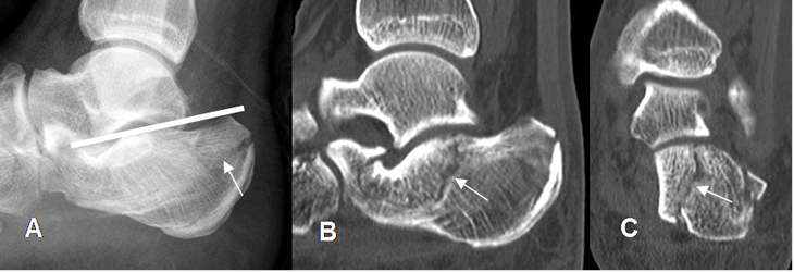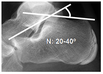 Se diagnostican con una proyección lateral, que permite medir el ángulo de Bohler. Esta formado por la intersección entre las líneas que unen la parte mas superior del calcáneo, con su parte anterior y posterior. La amplitud normal está entre 20º y 40º. En casos de fracturas, el ángulo está disminuido. (9). (Fig 45 y 46 A y B).