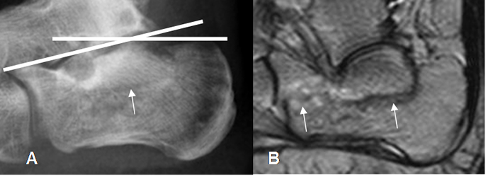 A: Rx lateral y B: RM sagital en T2. Fractura impactada, con disminución del ángulo de bohler.
