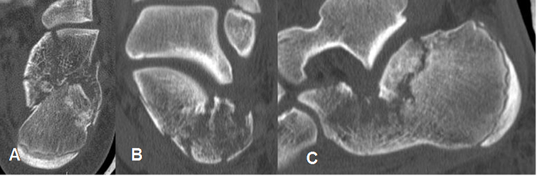 La mayoría de las fracturas son intra-articulares, producidas por un mecanismo de compresión axial.