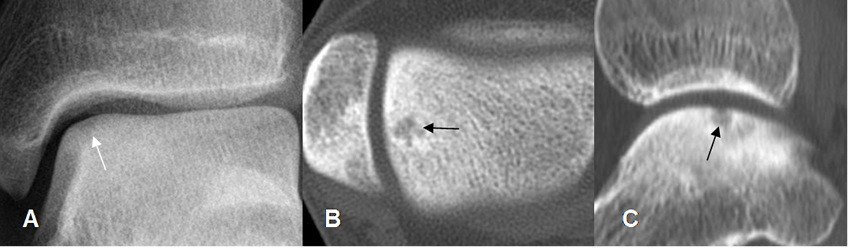 La RM es el estudio de elección para el diagnóstico, caracterización y determinar su estabilidad. La SI del fragmento es significante. Un fragmento hipointenso en todas las secuencias indica necrosis. Si el fragmento es hiperintenso en T1 o realza con el contraste, indica hueso viable. (1). (Fig 37 y 38).