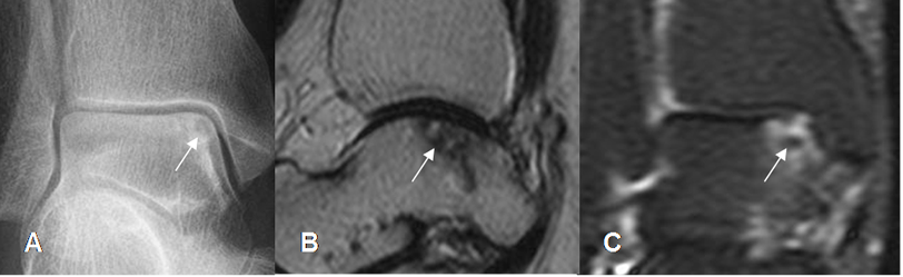 A: Rx AP. Sutil imagen radiolúcida en la región superointerna del talo.