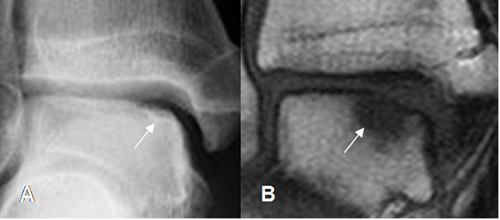 Un golpe en el borde medial o lateral del talo o sobre la plataforma tibial, pueden originar lesiones osteocondrales, que en ocasiones pasan desapercibidas a los Rx. (7).