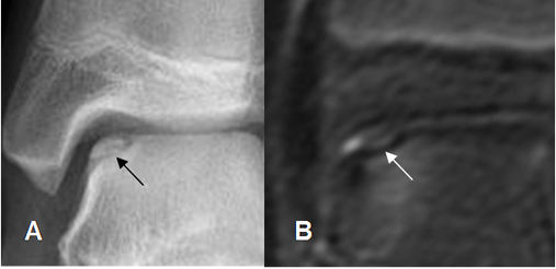 A: Rx AP y B: RM coronal en STIR. Fragmento desprendido, pero no desplazado.