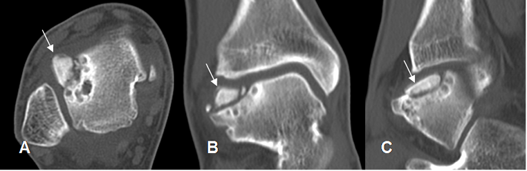 A: TAC axial, B: TAC reconstrucción coronal y C: TAC reconstrucción sagital. Lesión osteocondral en la parte superoexterna del talo, con gran fragmento óseo desprendido.