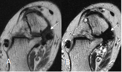 A: RM axial en T1 y B: RM axial en T2. Tejido blando fibroso en la parte medial del pie, que rodea el tendón del tibial posterior y ocasiona sindrome del tarso.