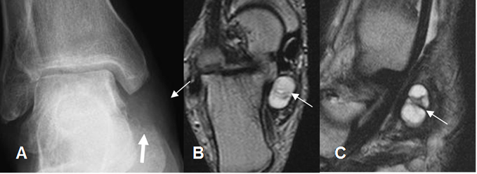 A: Rx AP. Prominencia de tejidos blandos, por debajo del maléolo interno y que remodela en calcáneo. (Flecha gruesa).