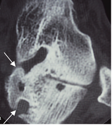 TAC axial. Cambios degenerativos con formación de osteofitos y puente óseo, en la parte medial de la articulación talocalcánea.