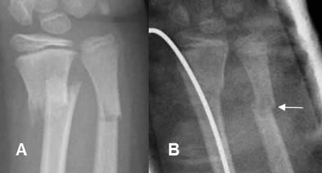 A: Rx AP. Fractura cabalgada del radio distal y en leño verde del cúbito.