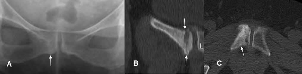 B: TAC reconstrucción coronal. Fractura no desplazada del pubis, con formación de callo óseo inmaduro.