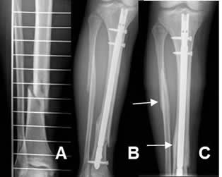 B: Rx AP. Reducción tibial con clavo de Kuntcher.
