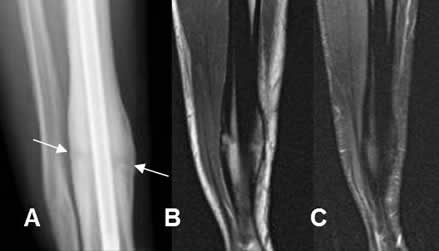 B: RM coronal en T1 y C: RM coronal en STIR. Callo óseo continuo, sin cambios inflamatorios.
