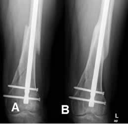 B: Rx AP después de 18 meses. Adecuada consolidación, con formación de callo óseo compacto.