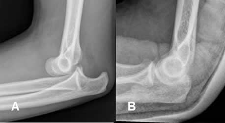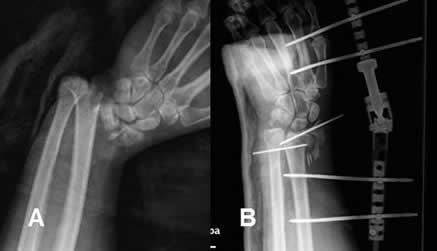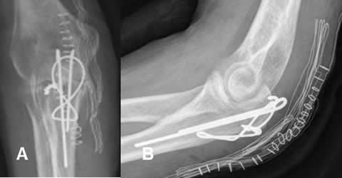 A: Rx AP y B: Rx lateral. Fractura del olécranon, estabilizada con agujas y alambres.