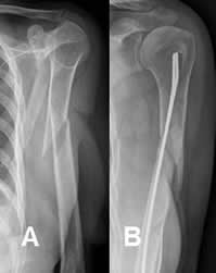 B: Rx AP. Reducción abierta y fijación intramedular, con clavo de enders.