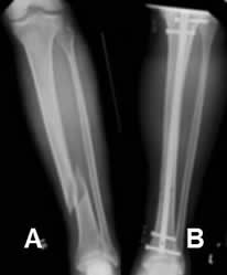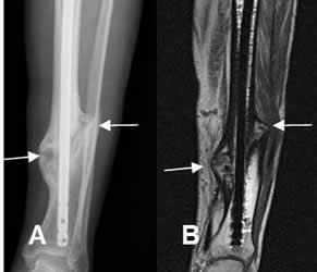 A: Rx AP. Fractura de la tibia estabilizada con clavo de Kuntcher. Clínicamente está consolidada, pero persiste línea radiolúcida entre los extremos.