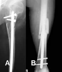 A: Rx AP. Fractura de la diáfisis femoral, estabilizada con clavo de Kuntcher.
