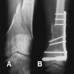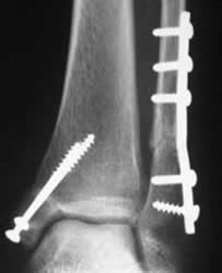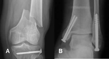 B: Fractura bimaleolar, fijada con tornillos de esponjosa.