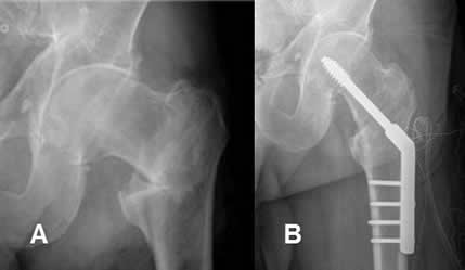 B: Rx AP. Reducción anatómica y estabilización con clavo de Kuntcher.