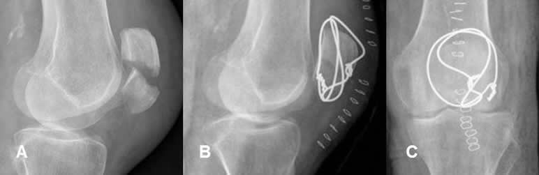 B: Rx lateral y C: Rx AP. Reducción de la fractura, mediante cerclaje con alambre.