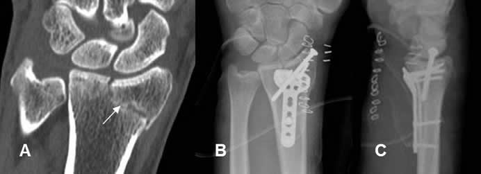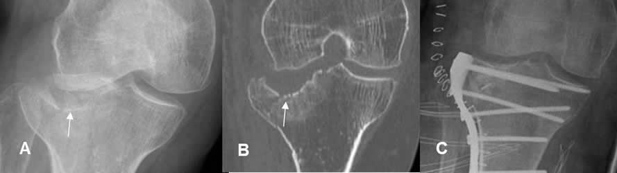 B: Rx AP y C: Rx lateral. Fijación de la fractura con placa de compresión y tornillos.