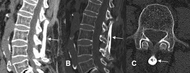 A y B: TAC reconstrucción sagital y C: TAC axial. Fijación posterior con un fragmento del peroné, sobre los elementos posteriores de L2-L3 y L4.