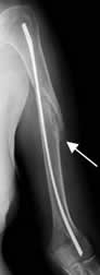 Rx AP. Fractura espiroidea en la diáfisis humeral, estabilizada con clavo de enders. Hay incipiente formación de callo óseo, secundario a la cicatrización por primera intención.