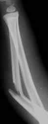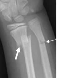 Rx AP. Fractura completa en el radio distal (Flecha gruesa) e incompleta en el cubito distal. (Flecha delgada).