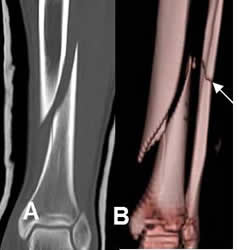 A: TAC reconstrucción coronal y B: TAC reconstrucción 3D. Fractura espiroidea en la diafisis tibial. Adicionalmente hay fractura oblicua del peroné.