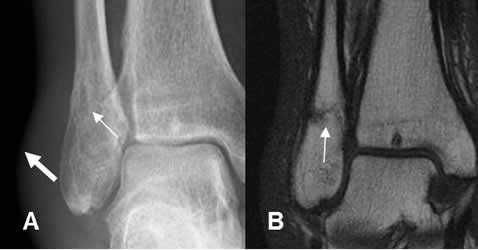 A: Rx tobillo AP y B: RM corte coronal. Fractura no desplazada del maléolo externo (Flecha delgada), con edema de tejidos blandos. (Flecha gruesa).