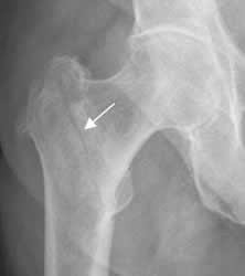 Rx AP. Fractura subtrocantérica de la cabeza femoral, con desviación medial del fragmento distal.