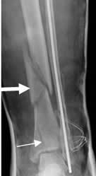 Rx AP. Fractura conminuta en la tibia distal. En la parte superior tiene el aspecto en mariposa (Flecha gruesa) y en la inferior hay otra fractura vertical. El paciente tiene material de osteosíntesis en al peroné, por fractura previa.