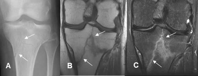 A: Rx AP, B: RM coronal en T1 y C: RM coronal en STIR. Fractura conminuta de la tibia proximal, no desplazada y con trazo en “Y”.