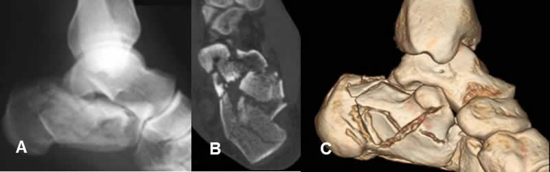 B: TAC axial y C: TAC reconstrucción 3D: Múltiples fragmentos óseos, por estallido del calcaneo.