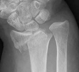 Rx AP. Fractura del radio distal, con desplazamiento lateral del fragmento distal.