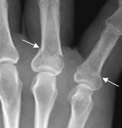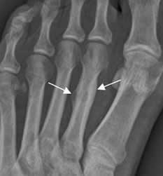Rx AP. Fracturas no desplazadas en las bases del 3º y 4º metacarpianos, cuyos fragmentos permanecen en contacto.