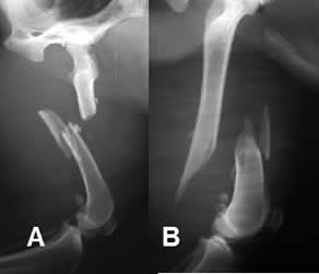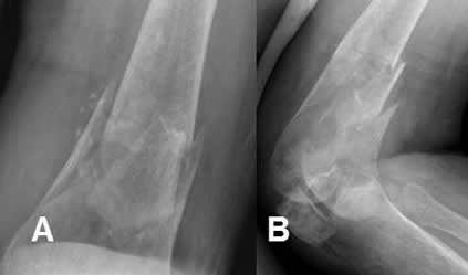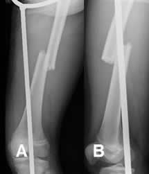 A: y B: Rx lateral. Fracturas conminutas, rotadas y diastasadas en las diáfisis femorales.