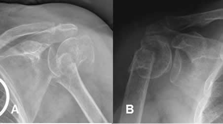 A y B: Rx AP de hombro. Fracturas impactadas y con diferente grado de desplazamiento de la cabeza humeral.