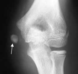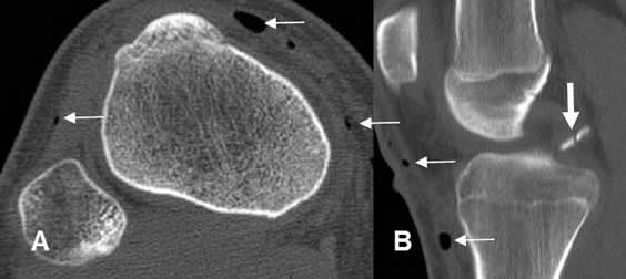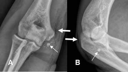A: Rx AP y B: Rx lateral. Trauma directo en el codo, con imágenes redondeadas y densas en la parte medial, que corresponden a cuerpos extraños. (Flechas delgadas). Igualmente se identifica aire en los tejidos blandos. (Flechas gruesas).