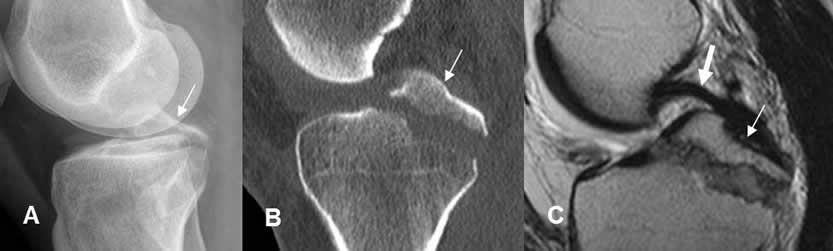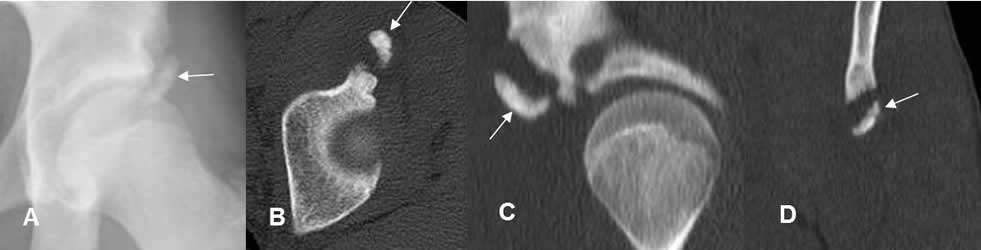 A: Rx AP, B: TAC axial, C: TAC reconstrucción sagital y D: TAC reconstrucción coronal. Fragmento en relación con la espina tibial anterior inferior, que corresponde a avulsión.
