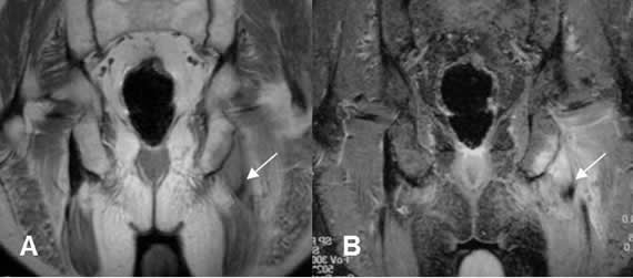 A: RM coronal en T1 y B: RM coronal en STIR. Cambios inflamatorios sobre la tuberosidad isquiática izquierda por avulsión. Hay retracción en el origen de los isquiotibiales.