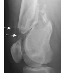 Rx lateral. Fractura conminuta del fémur distal con burbujas de aire en los tejidos blandos, por fractura expuesta.
