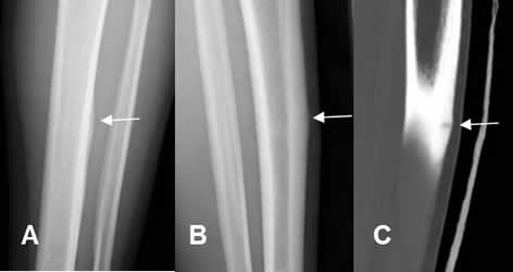 A: Rx AP, B: Rx oblicua y C: TAC reconstrucción lateral. Imagen en sentido transverso, sobre el tercio medio de la tibia, que corresponde a fractura de stress.