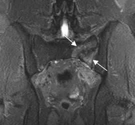 RM coronal en STIR: Edema en el alerón del sacro izquierdo, por fractura de stress.