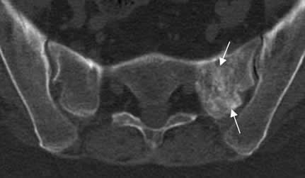 TAC axial. Zona de fibrosis en el alerón izquierdo del sacro, resultado de reparación por fractura de stress.
