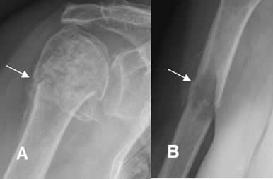 A: Rx AP. Alteración en la densidad de la cabeza del húmero, con matriz condroide, por la presencia de encondroma. Se aprecia fractura transversa y no desplazada a nivel del cuello.
