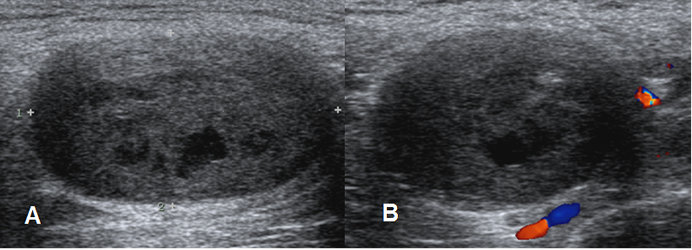A y B: Ecografía. Imagen ovalada, de bordes bien definidos y consistencia heterogénea, con algunas zonas quísticas. En el doppler es poco vascularizada y corresponde a neurofibroma.