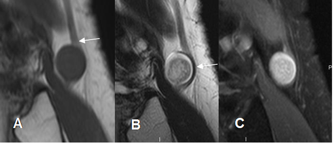 A: RM sagital en T1, B: RM sagital en T2 y C: RM sagital en STIR. Lesión excéntrica y fusiforme, que tiene continuidad con el nervio peroneo y corresponde a schwanoma. Presenta borde hipointenso en T2, que corresponde al epineuro. (Flecha en B).