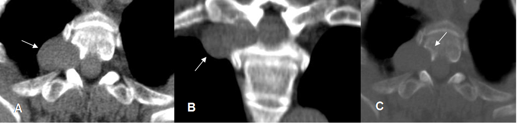 A y C: TAC axial y B: TAC reconstrucción coronal. Lesión sólida de bordes bien definidos que ensancha el agujero de conjunción derecho. Hay erosión del cuerpo vertebral, con reborde esclerótico. (Flecha en C).